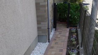 DIY作品集 東側アプローチ 東側のアプローチもこんな感じで完成です。北側より少し長めで、その先の南側の庭まで続きます。家とレンガ敷きアプローチとの間は北側同様に白い砂利が敷き詰めてあります。 2017.05.07 トカP DIY作品集ガルテンのDIY