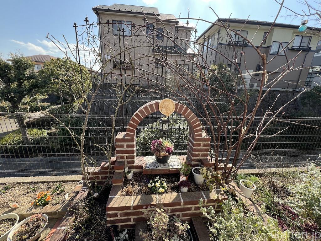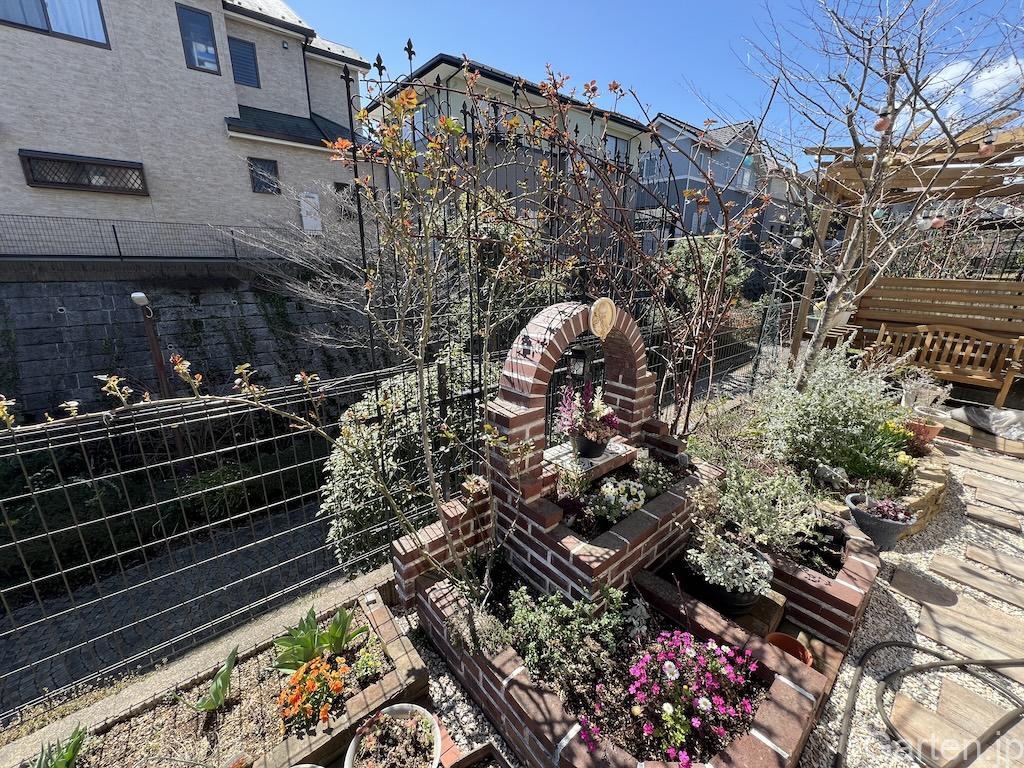 メインテラスの後に完成した、レンガアーチの花壇です。鉢植えも置き換えて変化が楽しめる、素敵な花壇になりました。春にはみごとなバラのアーチとなります。