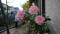 赤いバラよりも前から咲いています。家の壁際に植えたピンクのバラです。
