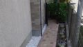 北側と東側のアプローチの接続部分。直角に曲がる部分で、レンガを横方向に敷いて伸ばしていけば良いと考えていましたが、実は敷地の形が微妙に曲がっていたり、邪魔な位置に受電用のポールが立っていたりして、単純にレンガを並べていくだけではうまくはめ込めません。どうしてもレンガを切断して丁度いい大きさにする必要があり、ここで覚悟を決めてグラインダーとレンガタガネを購入してレンガ切断に挑みます。