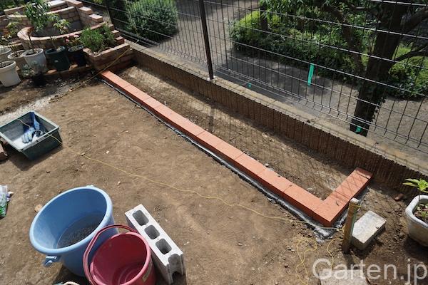 最初に作業用テラスを手掛けます。まずは、例によって基礎工事。レンガ枠の敷設場所に溝を掘って砕石を投入。しっかりと踏み固めた後に、枠用の赤レンガを仮置きして地盤の直線性と水平性を確認します。
